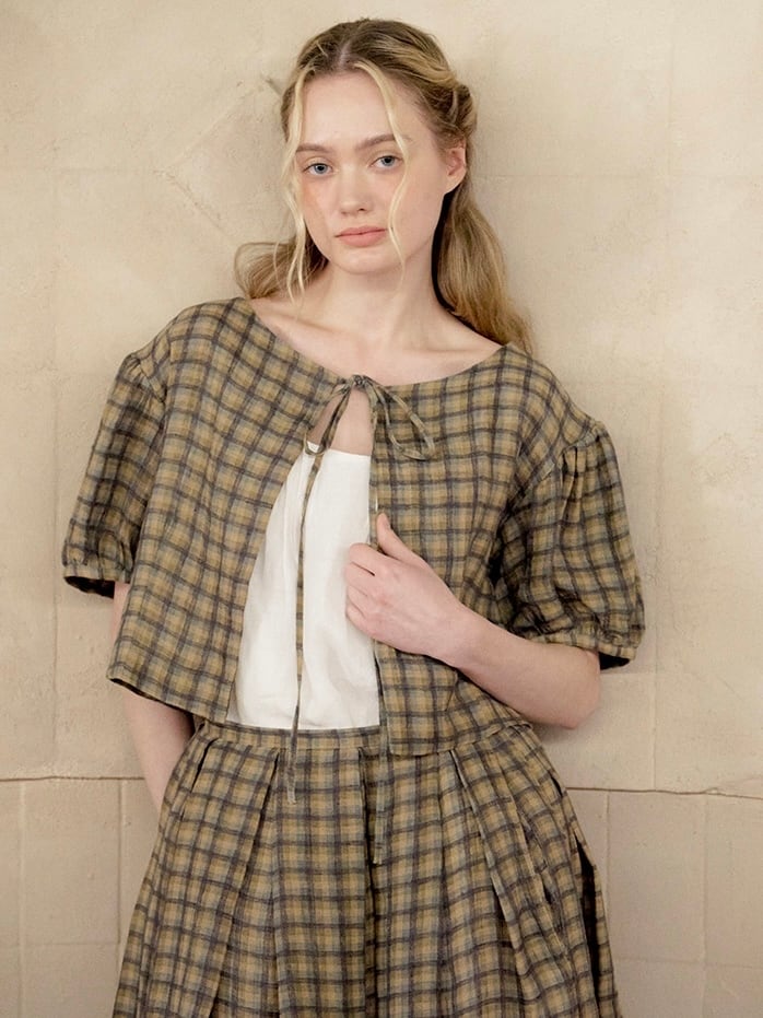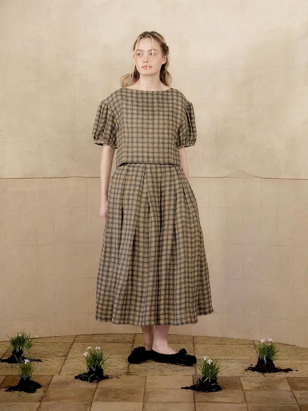 ボリュームのある袖やチェック柄、プリーツの立体感が調和し、