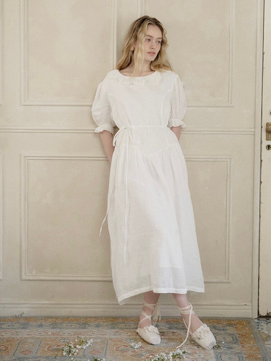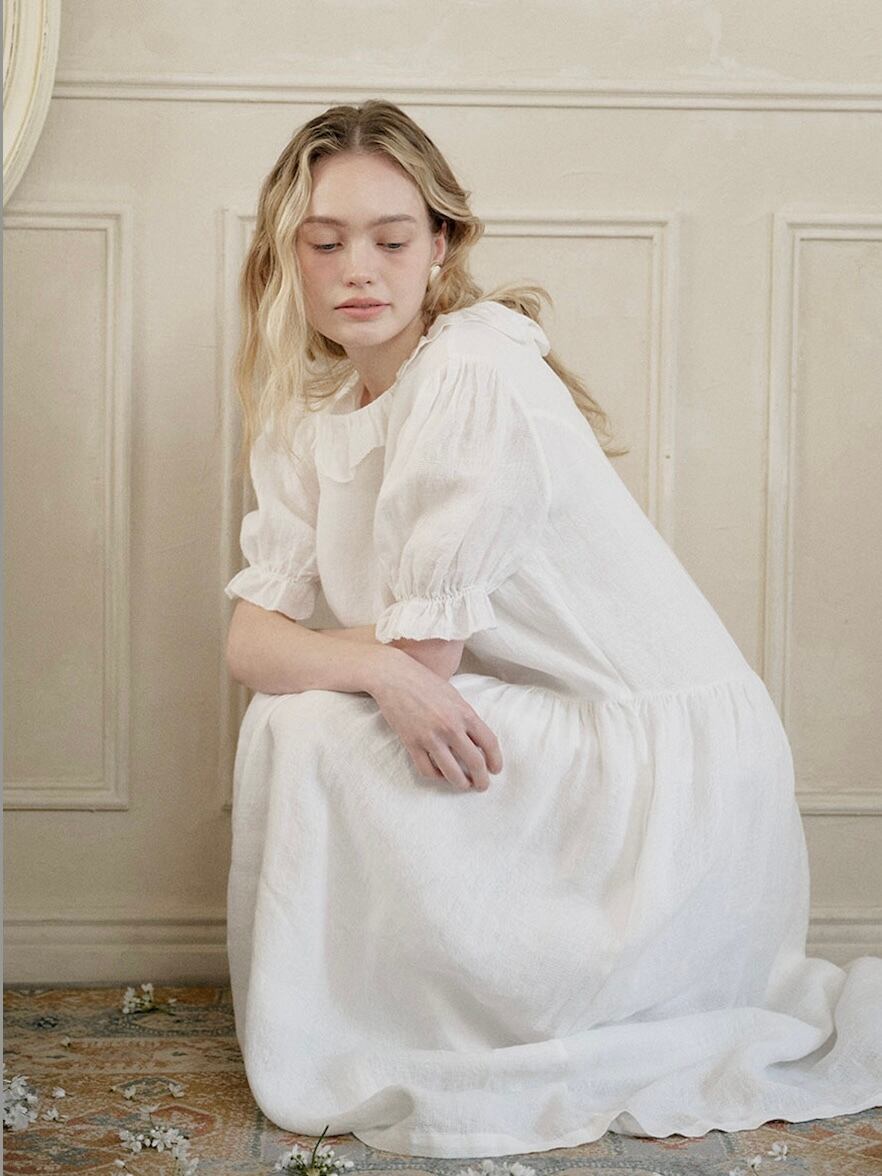 首元に沿ってやわらかくカーブするスカラップ襟が、印象的な一枚です。