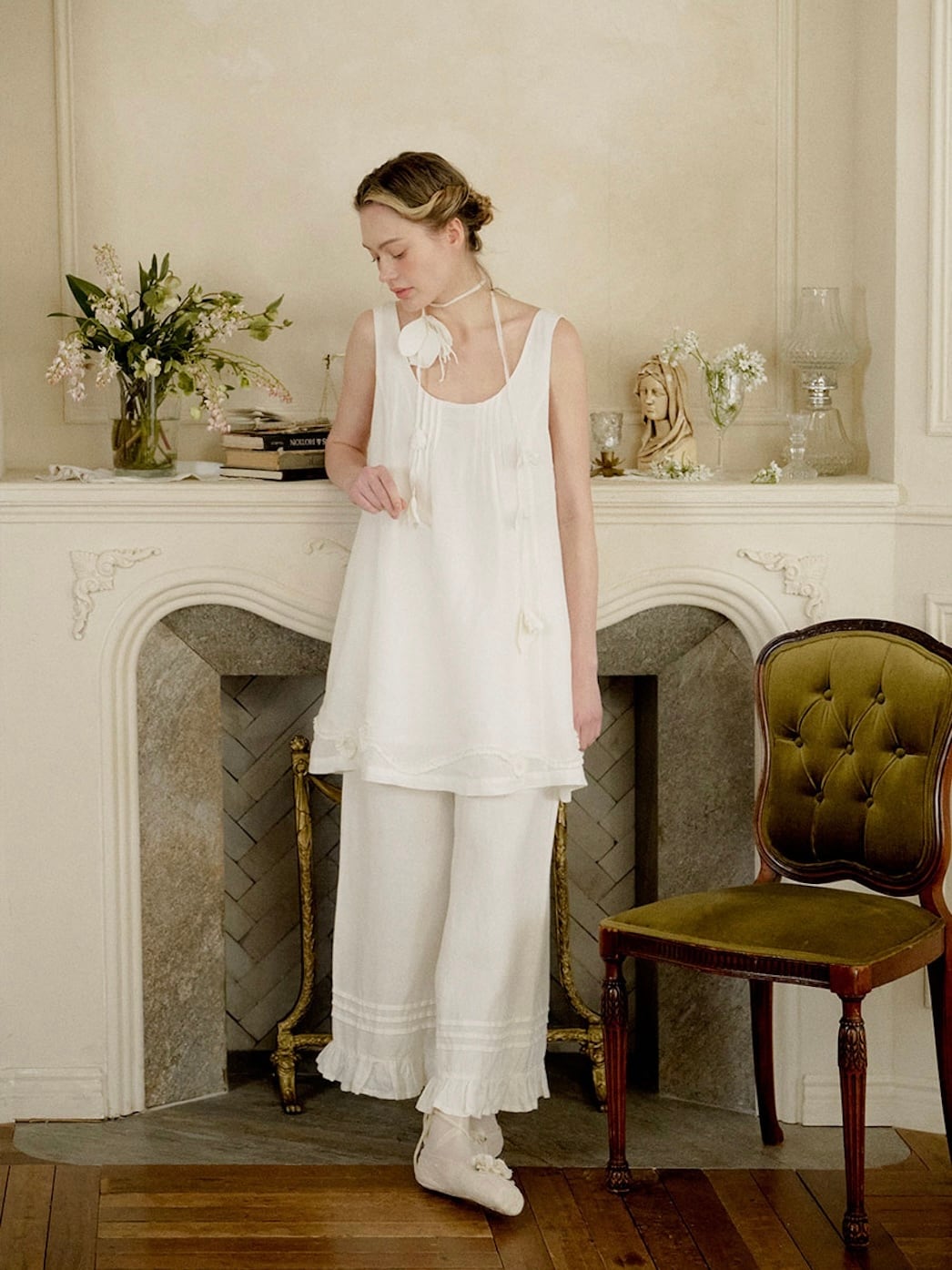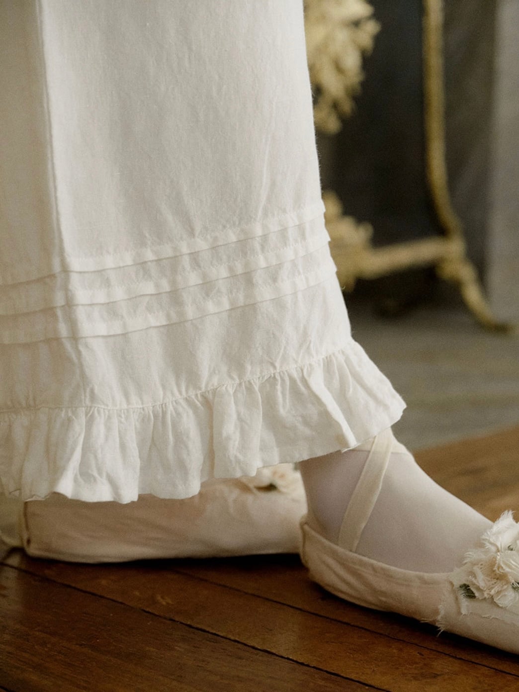 アンティーク調のピンタックと裾のフリルが、やさしい表情を添える一着です。