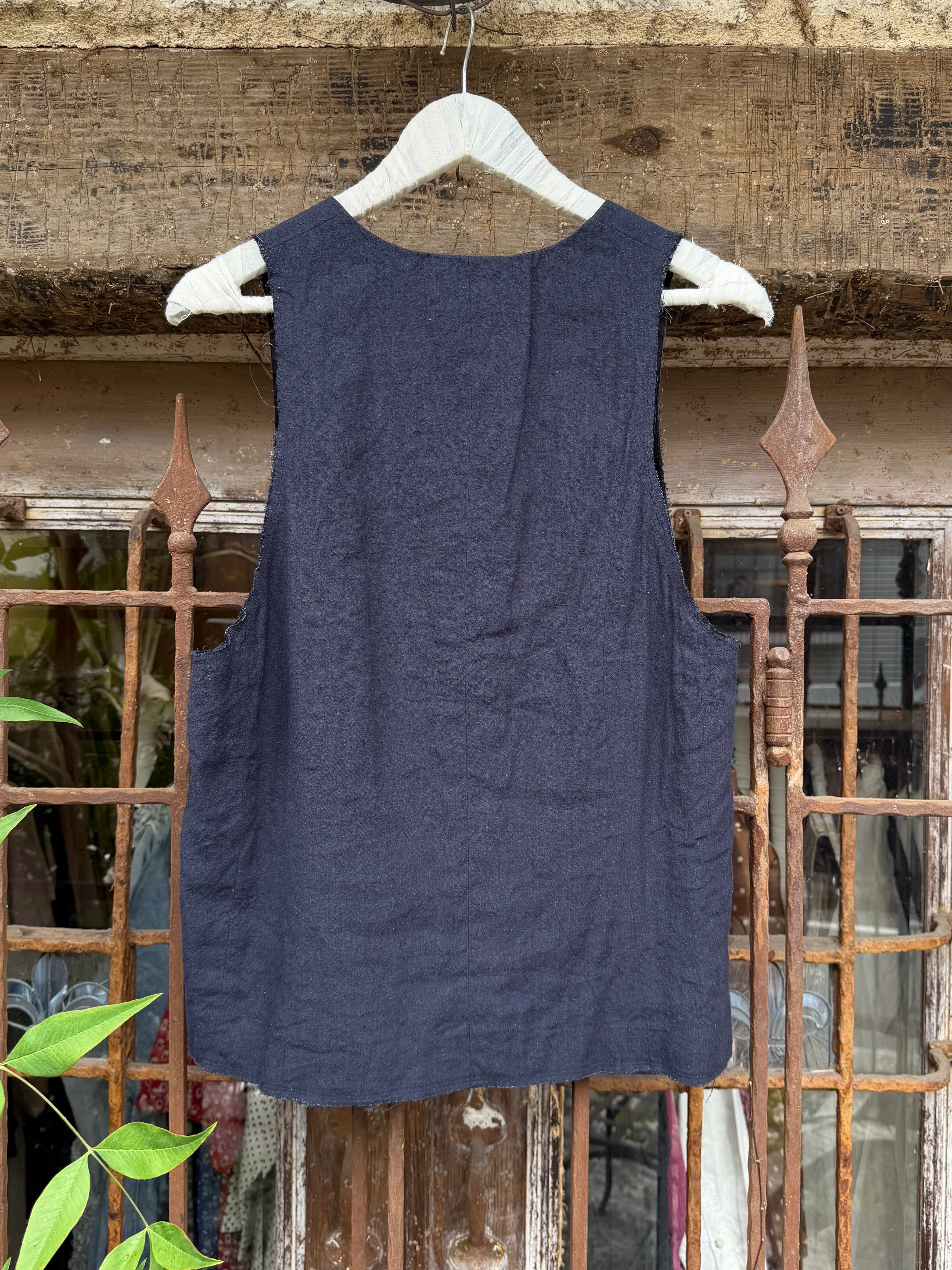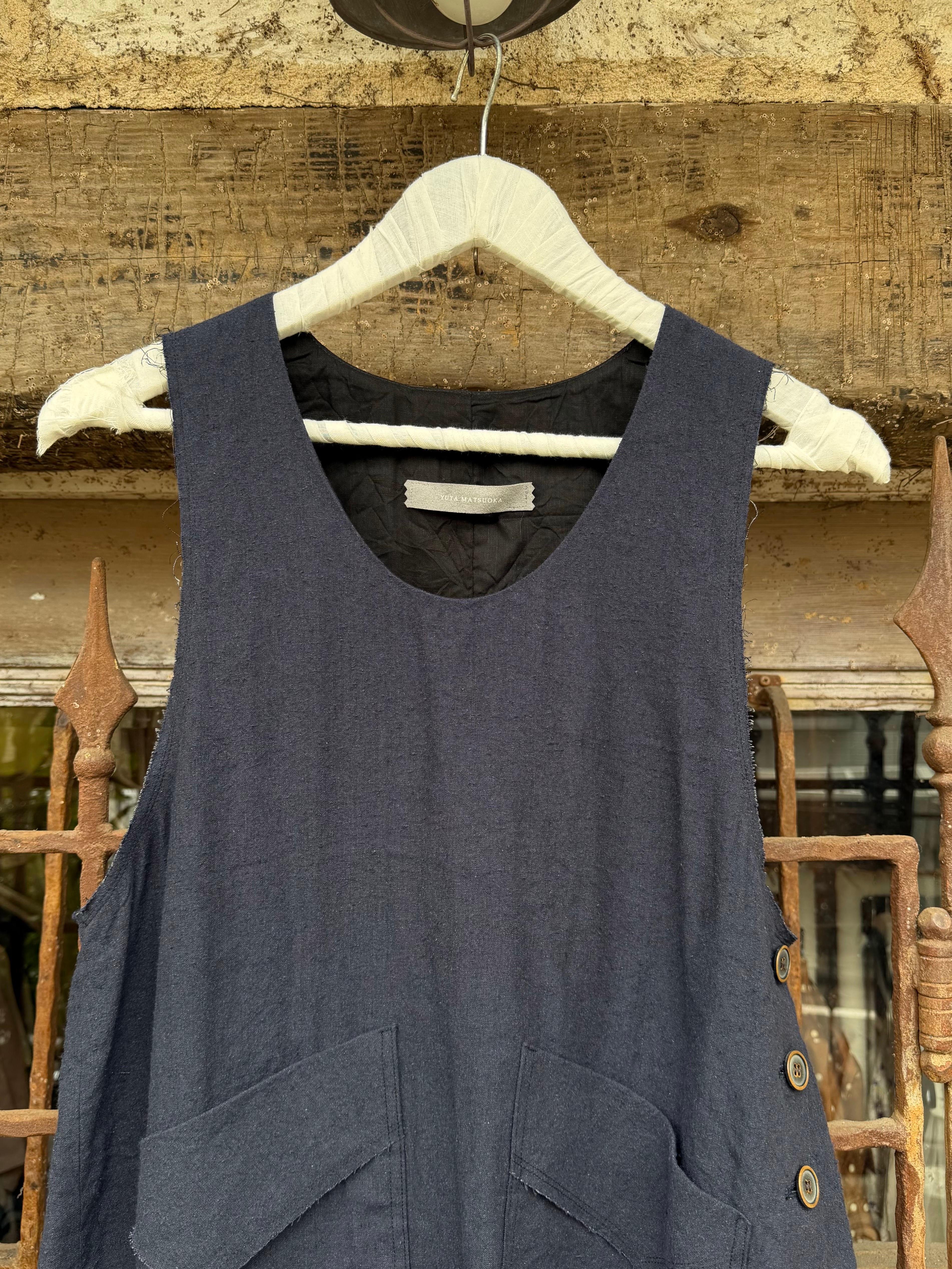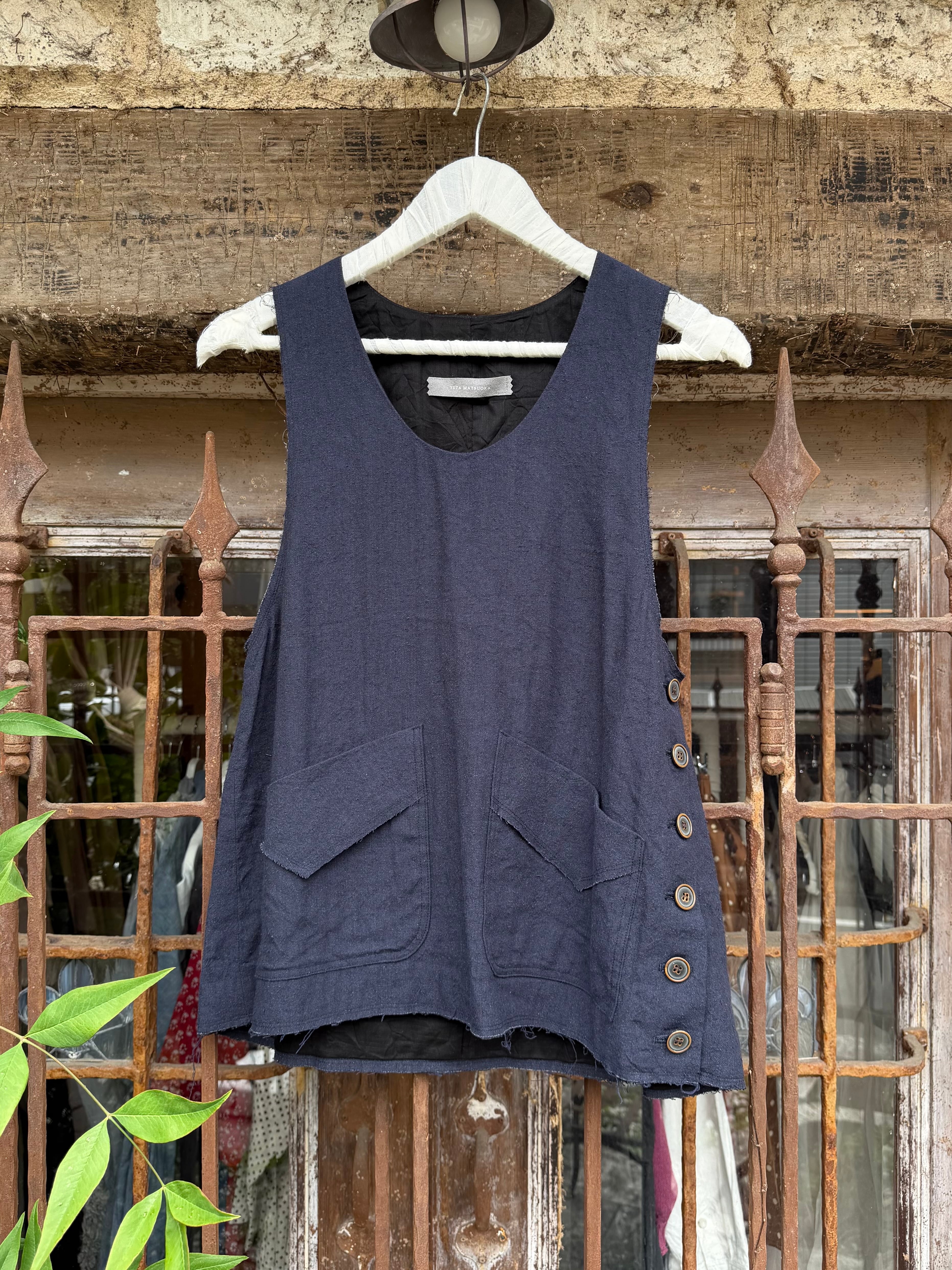 商品番号:26s12pulvn Color:NAVY サイズ:2 総丈:62.0cm 身幅:51.0cm 肩幅:30.0cm 素材 LINEN:54% SILK:46% ° LINING COTTON:90% LINEN:10% 左脇がフルオープンになるプルオーバータイプのベスト。 シャツの上にもTシャツの上にもレイヤードする為に、襟ぐりは少し広めの設計。 所々打ち切りの仕様で、このアイテムだけでも一癖あるスタイリングになるようなデザイン。