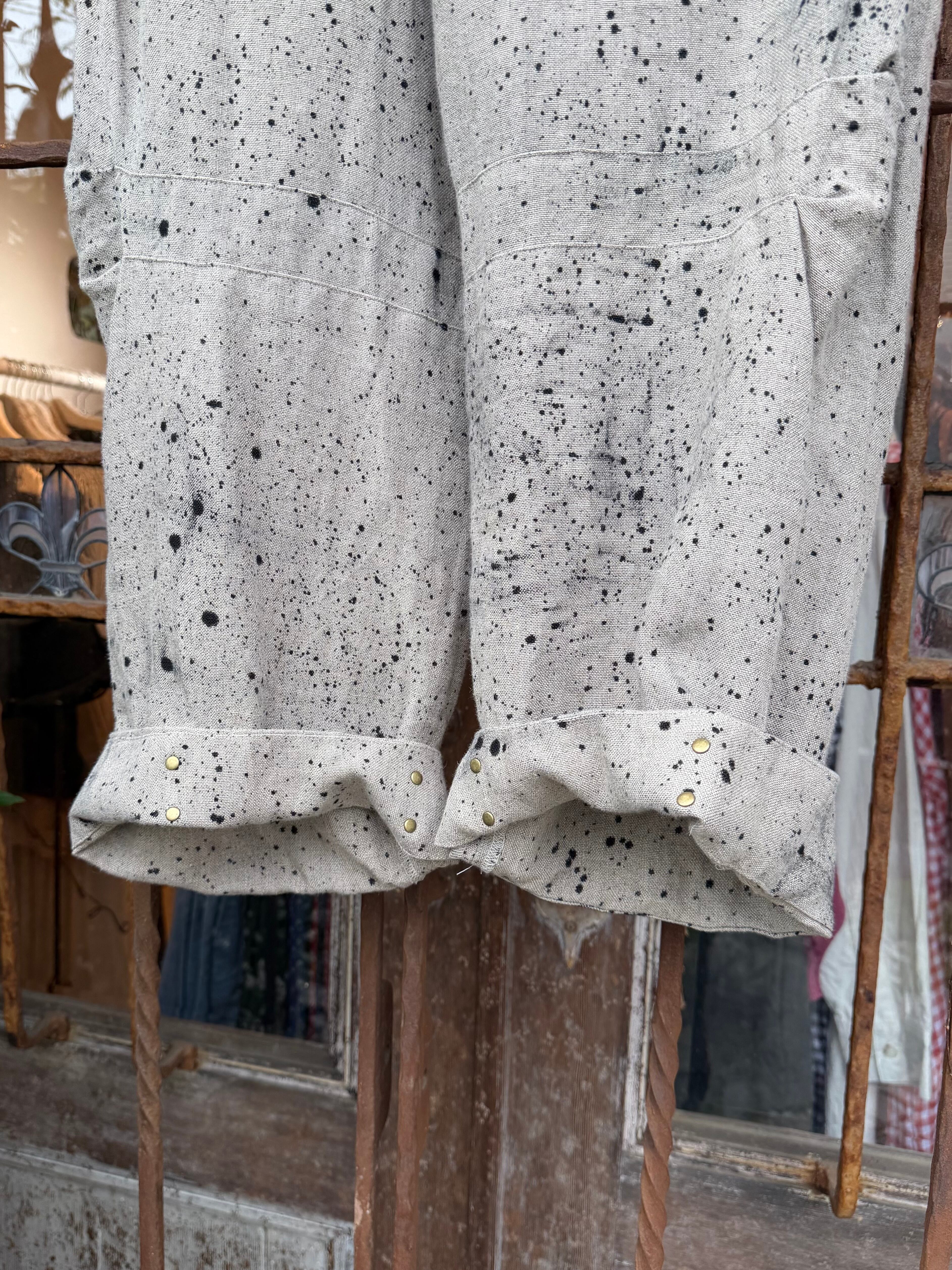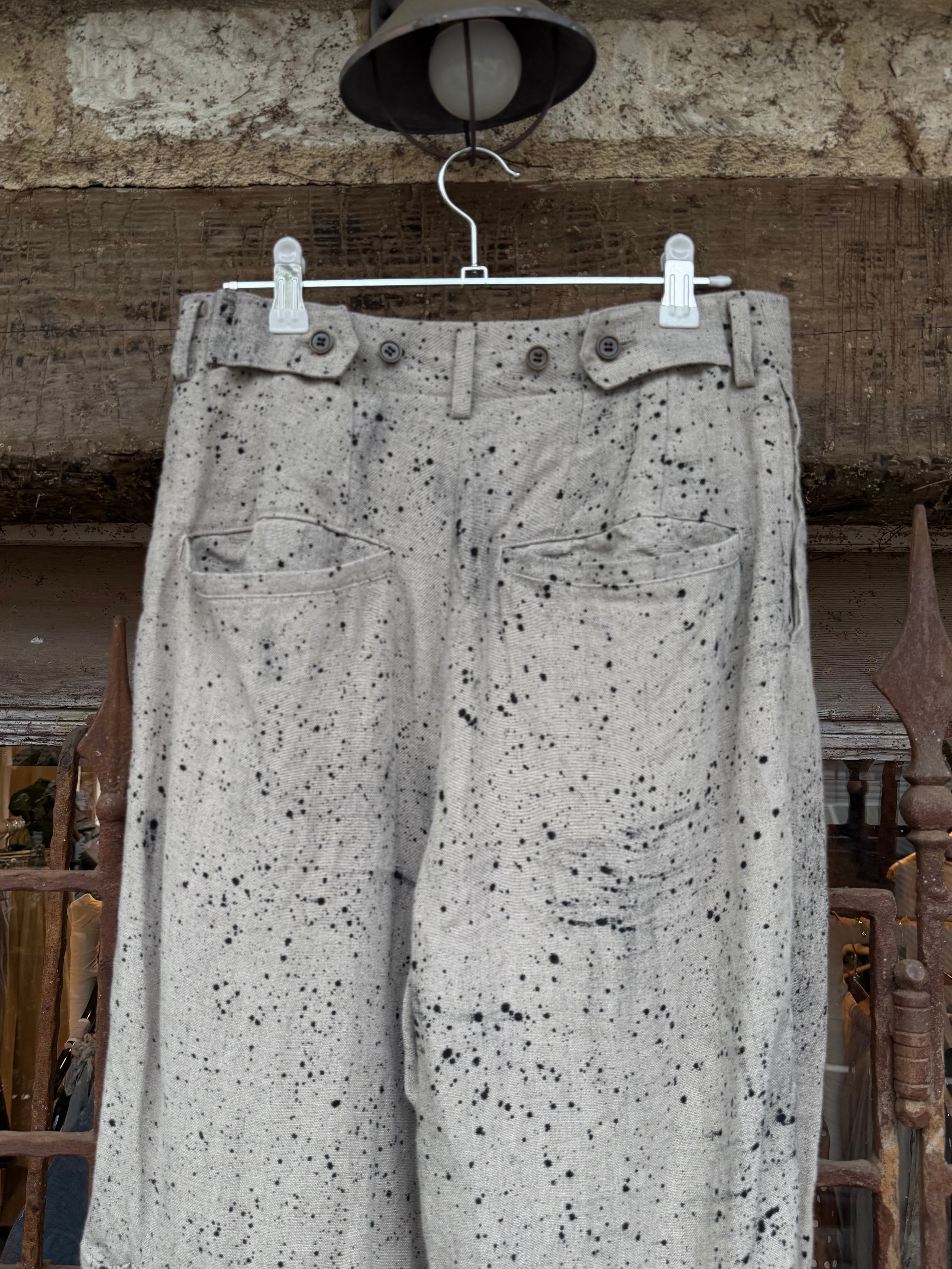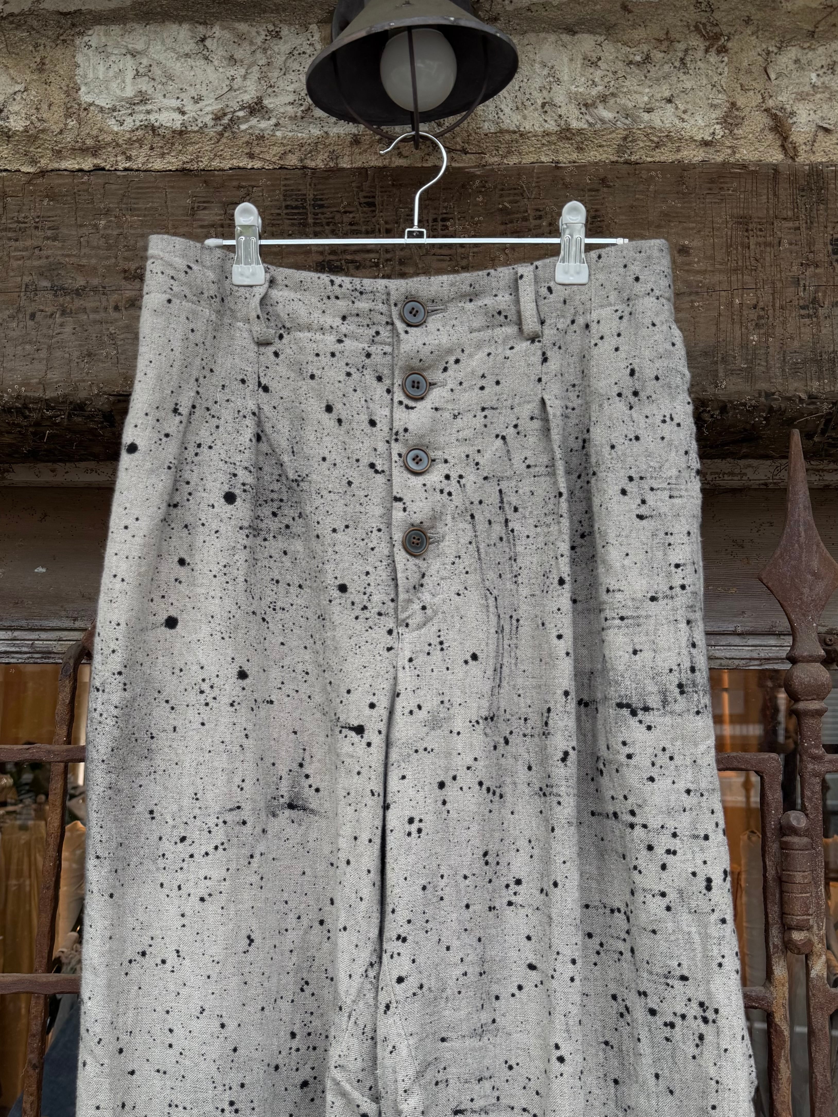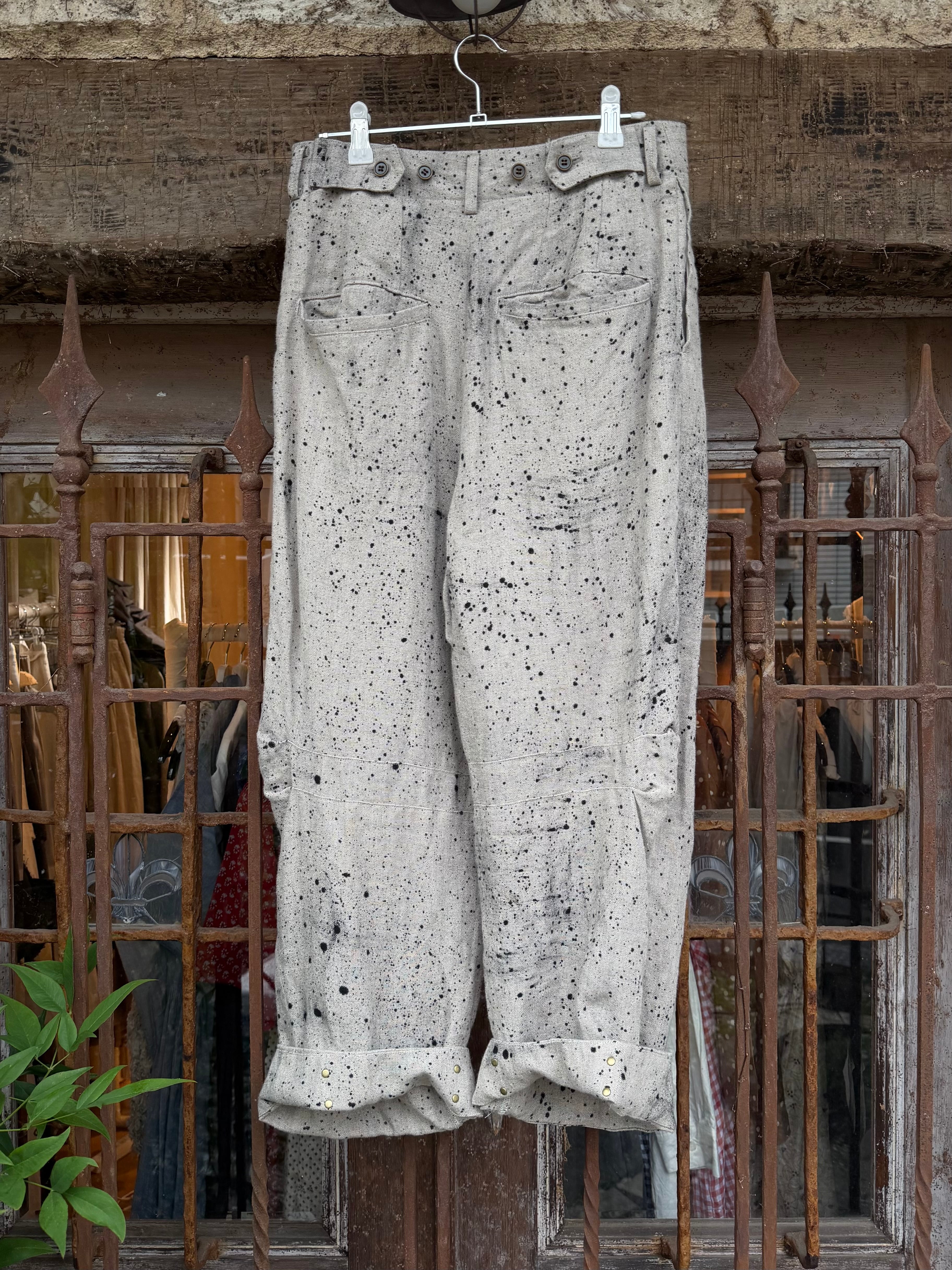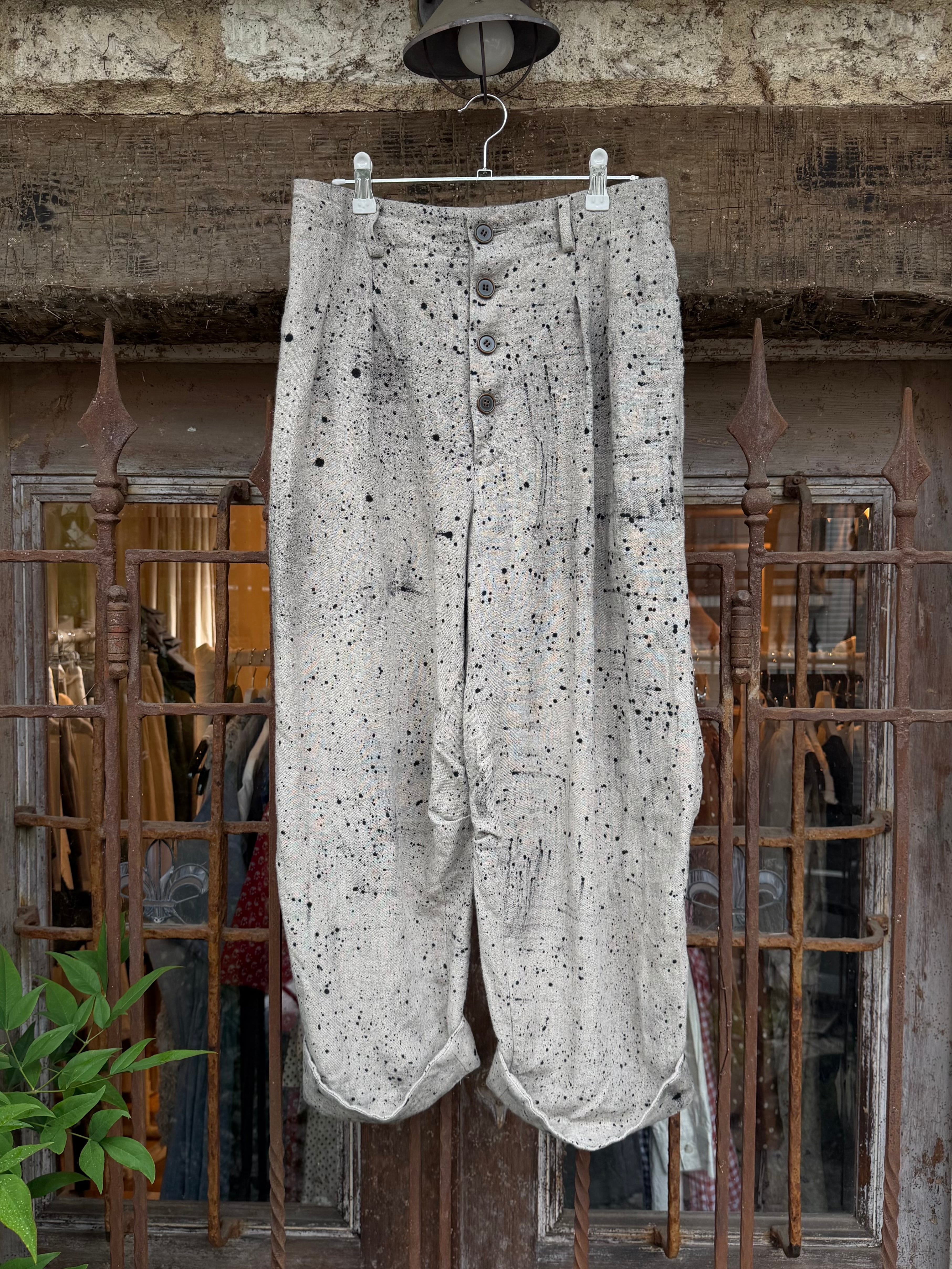 商品番号:26s20hpe カラー:Ecru サイズ:2 ウエスト:36.0cm 股上:33.5cm 股下:64.0cm わたり幅:34.0cm 裾幅:24.5cm 素材 LINEN 100% ウエストは2タックでゆったり。 裾にかけて少しだテーパードをきかせて、膝裏のタックで膝の立体感を作った。 裾は見返しの仕様で、折り返してダブルのようにしたり、後ろのホックを留めてテーパードを強調したシルエットに変更が可能。