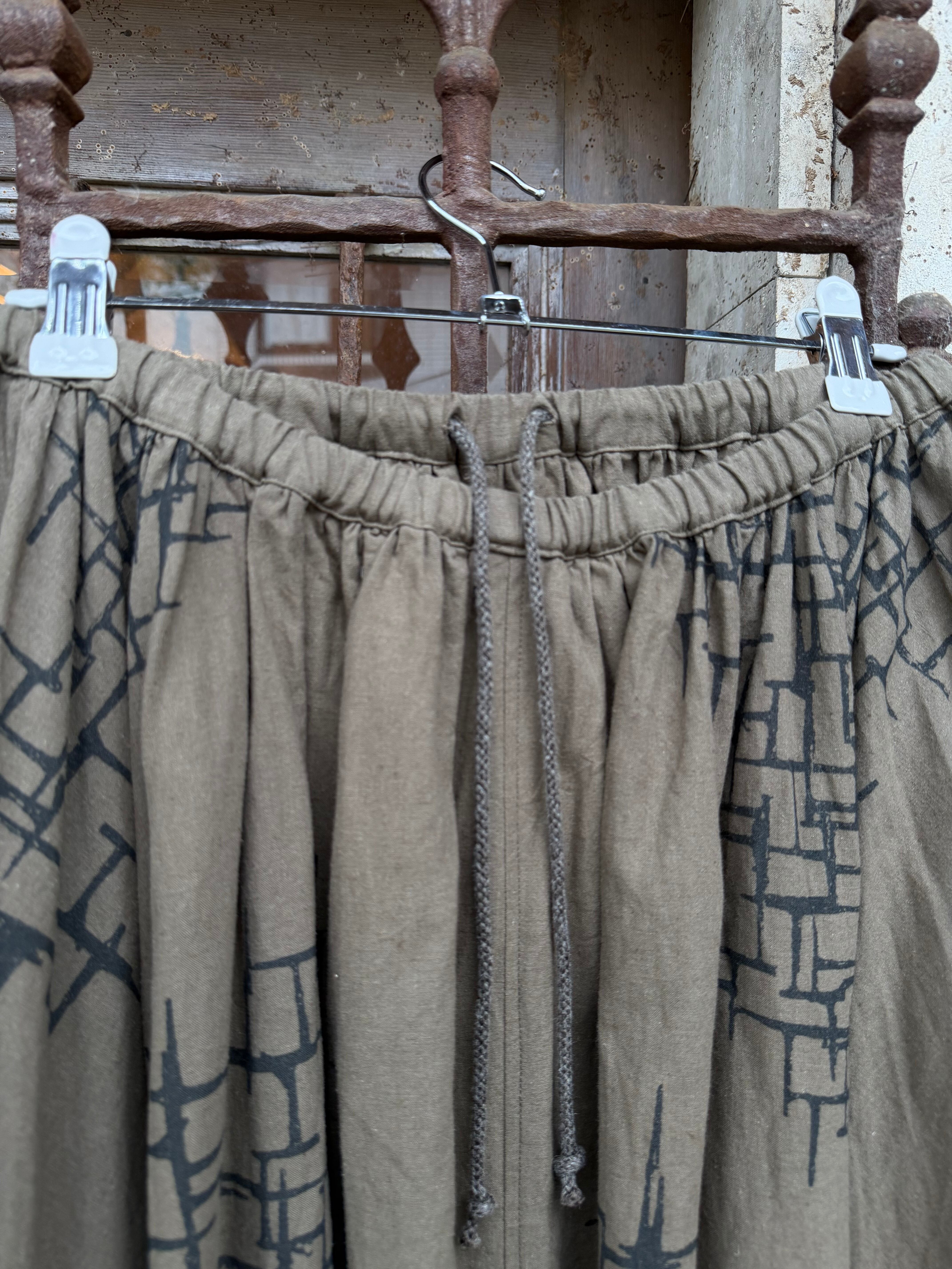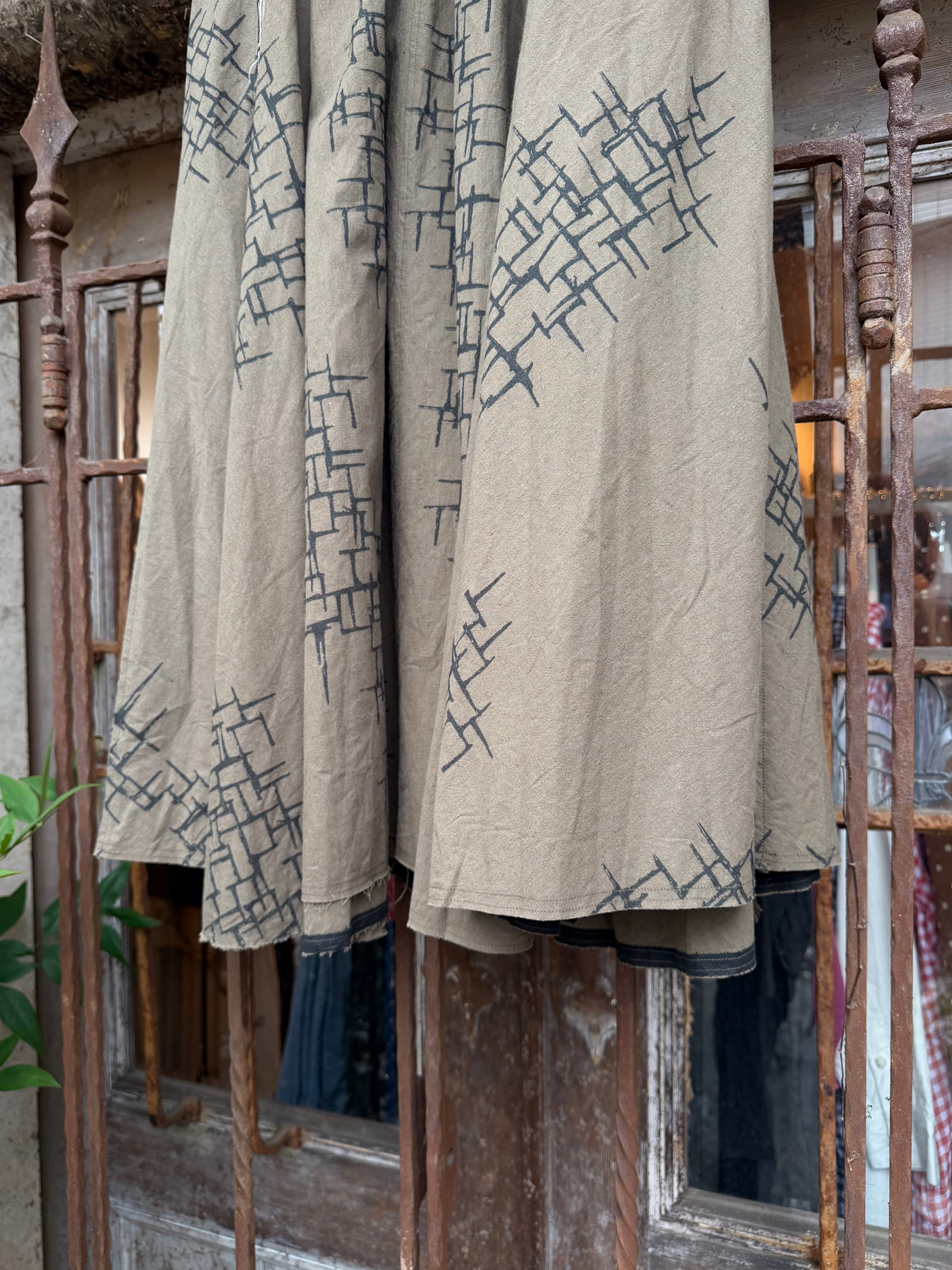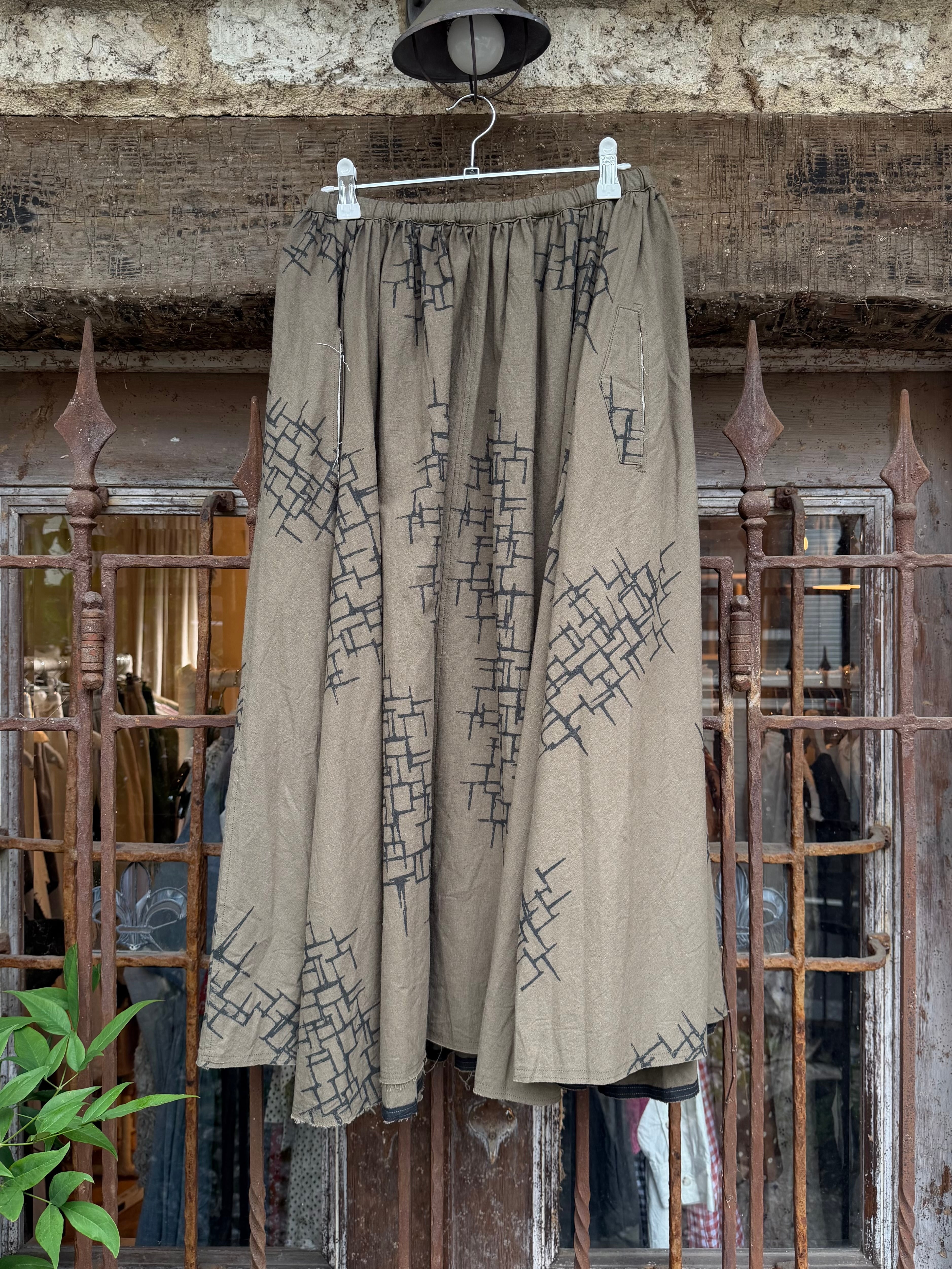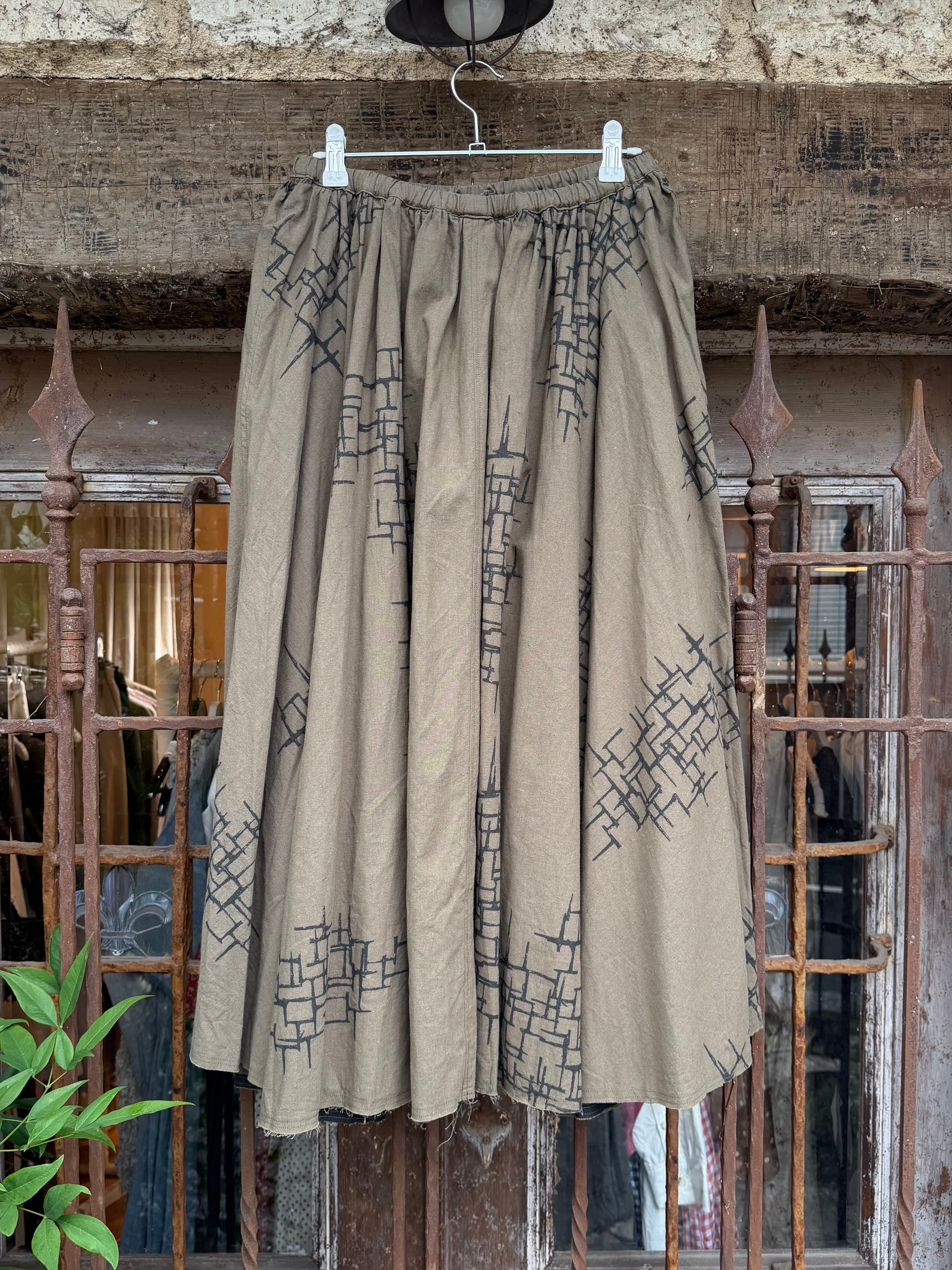 商品番号:26s46gskkp カラー:Khaki print サイズ:2 ウエスト:30.0cm 着丈:81.5 cm 素材 LINEN 55%、COTTON 45% 4枚パネルのフレアギャザースカート。 裾は断ち切り。フレアなパターンに更にギャザーをよせて動きのあるデザインに。